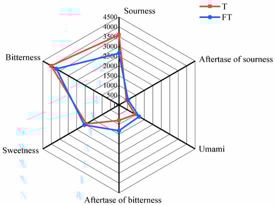 E-tongue analysis of the taste characteristics of Tartary buckwheat leaf tea fermented with E. cristatum or not. T: raw Tartary buckwheat leaf tea. FT: fermented Tartary buckwheat leaf tea.