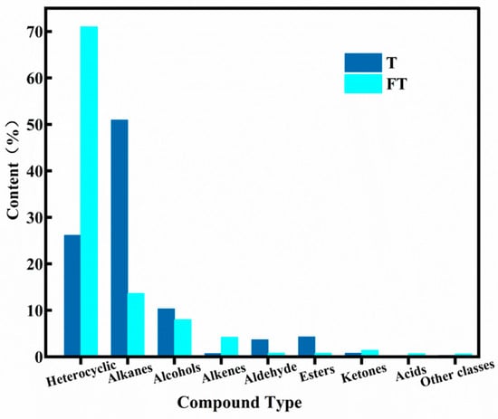 Relative contents of different types of volatile aroma components. T: raw Tartary buckwheat leaf tea. FT: fermented Tartary buckwheat leaf tea.