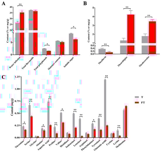 Changes in the contents of major tea substances of Tartary buckwheat leaf tea before (T) and after E. cristatum fermentation (FT). (A) Water infusion, total flavonoids, total polyphenols, moisture contents and soluble sugars. (B) Tea pigments. (C) Amino acids. T: raw Tartary buckwheat leaf tea. FT: fermented Tartary buckwheat leaf tea. Star-marked (*) groups represent umami and sweet amino acids. Octothorpe-marked (#) groups represent the sour and bitter amino acids. Each experiment was repeated 3 times. Statistical significance was determined by Students t-test (* p value < 0.05, ** p value < 0.01).