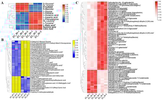 Hierarchical cluster analysis of the differential levels of chemical compounds in the tea samples. (A) Part of the taste-related free amino acids, saccharides and organic acids. (B) Part of the phenolic acids. (C) Part of flavonoids and proanthocyanins. Star-marked (*) groups indicate possible isomers exist.