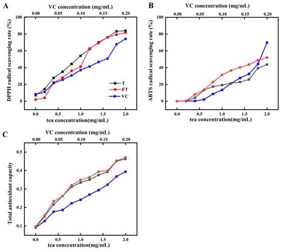 The scavenging assays of DPPH, ABTS radicals and the ferric ion reducing power were used to evaluate the antioxidant activity of tea extract. As shown in Figure 7, tea extract displayed a dose-responsive antioxidant ability consistent with VC. For the DPPH radical-clearing rate and the total antioxidant capability, fermented Tartary buckwheat leaf tea showed rather similar levels of antioxidant activities with unfermented leaf tea (Figure 7A,C). As shown in Figure 7B, the ability of fermented tea to scavenge ABTS free radicals (IC50 = 1.082 mg/mL) is significantly stronger than that of unfermented tea, with the concentrations being above 0.6 mg/mL. ABTS can reflect the electron and proton transfer abilities of antioxidants []. The antioxidant active substances in tea mainly include tea polyphenols and other phenolic compounds []. These substances have different mechanisms of action on various free radicals and will show different trends in scavenging different free radicals. These results indicated that the total antioxidant activity of Tartary buckwheat leaf tea was not significantly downregulated by E. cristatum fermentation, while the antioxidant activity against ABTS was enhanced. As flavonoids and phenolic acids were important and nonnegligible antioxidants in Tartary buckwheat, the contents of some of the flavonoids and phenolic acids were upregulated remarkably after fermentation (Figure 6C), such as 3-methylkaempferol (log2FC = 4.95), 3-O-methylgallic acid (log2FC = 4.81), digallic acid (log2FC = 2.18), etc. This result may partially explain the increased antioxidant activity against ABTS.