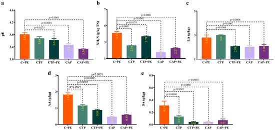 (a–e): Nutrient composition and fermentation characteristics (expressed on dry matter basis) of C+PE (ensiled corn covered with polyethylene), CTP [ensiled corn (75%) covered with tomato pomace (25%)], CTP+PE [ensiled corn (75%) covered with tomato pomace (25%) and covered with polyethylene], CAP [ensiled corn (75%) covered with apple pomace (25%)], CAP+PE [ensiled corn (75%) covered with apple pomace (25%) and covered with polyethylene] samples. NH3N: ammonia nitrogen; LA: lactic acid; AA: acetic acid; BA: butyric acid.