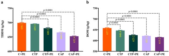 (a,b): The digestibility values of C+PE (ensiled corn covered with polyethylene), CTP [ensiled corn (75%) covered with tomato pomace (25%)], CTP+PE [ensiled corn (75%) covered with tomato pomace (25%) and covered with polyethylene], CAP [ensiled corn (75%) covered with apple pomace (25%)], CAP+PE [ensiled corn (75%) covered with apple pomace (25%) and covered with polyethylene] samples. TDDM: truly digestible dry matter; DOM: digestible organic matter.