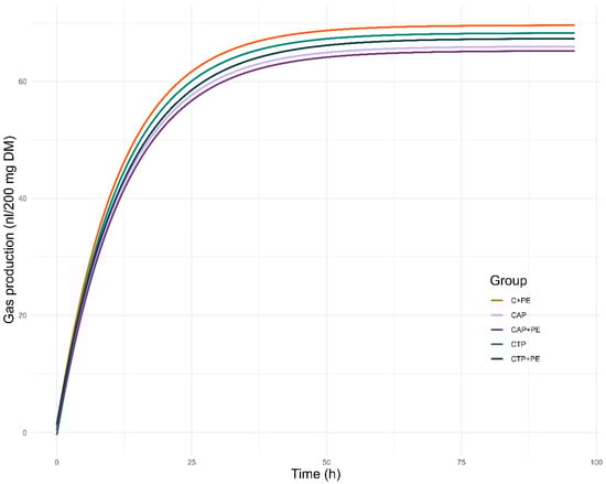 The in vitro gas production of C+PE (ensiled corn covered with polyethylene), CTP [ensiled corn (75%) covered with tomato pomace (25%)], CTP+PE [ensiled corn (75%) covered with tomato pomace (25%) and covered with polyethylene], CAP [ensiled corn (75%) covered with apple pomace (25%)], CAP+PE [ensiled corn (75%) covered with apple pomace (25%) and covered with polyethylene] samples.