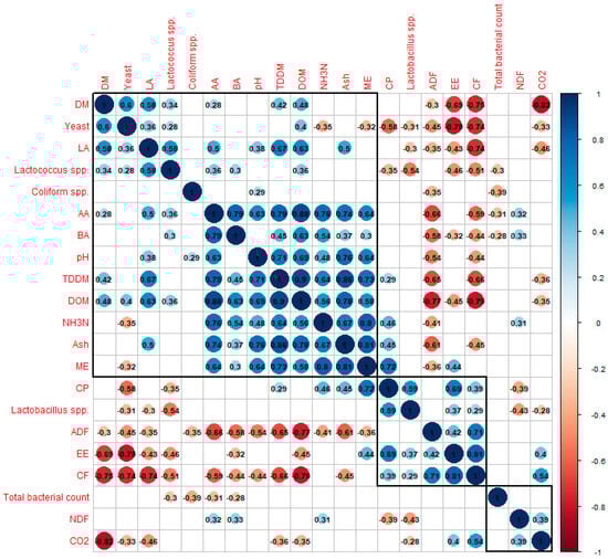 All data were expressed as mean ± standard error of mean (SEM). The significance of each experimental group with respect to the control group, traditionally preserved corn silages (CPE), was assessed by means of ANOVA followed by Dunnett’s multiple comparison test. To assess the strength and direction of association between fermentation characteristics, chemical and microbial compositions, and CO2 production during aerobic stability values, a correlogram was created for visualization in the “corrplot” package as previously described by wei et al. []. In addition, the biplot order was shown using the R packages “ggplo” plus “factoextra” and “FactoMineR”, which are based on principal component analysis (PCA), following a modified version of Türkgeldi et al. [].