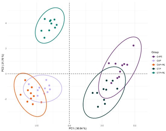 Corn silage characteristics are influenced to various degrees by organic waste use as covering materials (Figure 8). According to PCA (principal component analysis), the first two PCs (principal components) account for 58.40% of the total variability. Specifically, PC1 explains 36.64% of the total variability, while PC2 accounts for the remaining 21.76%. Additionally, upon closer examination of this figure, corn silages in which TP and PE were used jointly as covering materials exhibit differences in silage characteristics compared to other groups. Traditionally preserved corn silages (CPE) have been determined to share similarities with corn silages in which only TP (CTP) is used as the covering material but differ from other silage categories. Furthermore, it is evident that corn silages in which AP is used alone (CAP) or in combination with PE (CAP+PE) as a covering material possess similar properties but diverge from other groups.