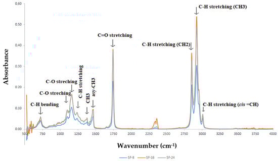 The spectra of sunflower oils were obtained using Fourier Transform Infrared (FTIR) spectrometry before and after use as sunflower oils. The wavenumbers corresponding to the oleic (C18:1), linoleic (C18:2), palmitic (C16:0), and stearic acid (C18:0) fatty acids present in sunflower oil were characterized. This method enables the detection of polymerization, oxidation, and esterification reaction products in oils based on the wave numbers and regions where bands occur because of the vibrational energies of the molecules constituting these acids in the oil. Each band observed in the spectrum facilitated the identification of functional groups in the measured sample. The FTIR spectra of the oils are shown in Figure 1. The polarity of the non-waste oil was determined to be eight and the sample was coded as SF-8. This sample was used as the control. Waste oils with polarities of 16 and 24 were coded as SF-16 and SF-24, respectively.
