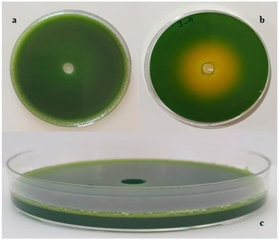 The medium proposed by Hesham et al. [] was modified and used to select producer microorganisms. The medium components and concentrations (g/L) were as follows: waste oil, 60; NH4Cl, 0.6; KH2PO4, 1; MgSO47H2O, 1; yeast extract, 1; bromocresol green, 0.2; Triton X-100, 1.5; and agar, 20. Waste sunflower oil (60 g/L) with a polarity of 16 was added to the culture medium instead of glucose but the pH was not adjusted. Wells were created on each agar plate and 150 µL of the active yeast culture was separately added to each well. The yellow-colored zones formed by acid formation of the strains incubated at 28 °C for 48 h were measured.