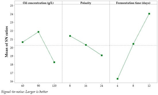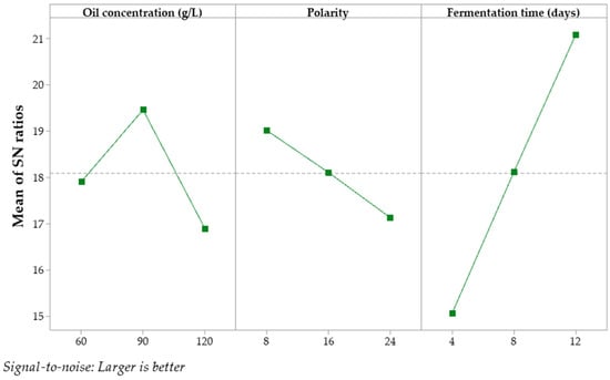The objective of optimizing the process parameters was to enhance the S/N ratio, thereby achieving superior outcomes. The optimal levels for each factor were identified to minimize the variability and maximize the concentrations of CA and ICA. The highest S/N ratios for each factor were observed using 90 g/L of non-waste sunflower oil after 12 days of fermentation. The main effects plots for the S/N ratios are shown in Figure 3 and Figure 4.
