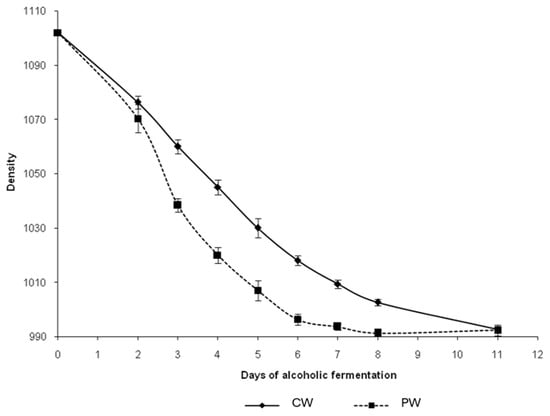 22]. This effect was visually observed during vinification by a noticeable degradation of grape berries in the PW just after 3 days of fermentation, while the CW still showed intact berries. However, this increase in free-run wine in the PW had no effect on their alcoholic strength, as they were the same in both set of wines.