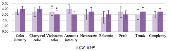 Figure 3 indicates the results of the descriptive sensory assay performed on both sets of wine. Despite slight variations, the statistical results indicate that the samples did not differ significantly for any of the attributes studied, except for the violet hue, which was higher in the CW. Although some studies have described an increase in the color intensity of wines treated with enzyme preparations [