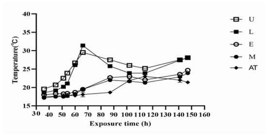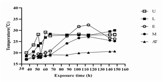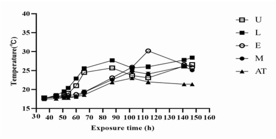 Effect of additive application on the temperature change in amaranth and corn powder mixed silage after exposure to aerobic conditions at 70% moisture content. U, control; L, lactic acid bacteria; E, cellulase; M, mixture of lactic acid bacteria and cellulase; AT, ambient temperature.
