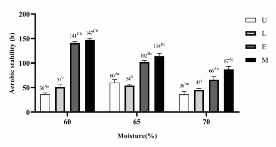 The effects of moisture content and additives on temperature changes in mixed amaranth and cornmeal silage under aerobic conditions are shown in Figure 1, Figure 2, Figure 3 and Figure 4. At 60% moisture content, the temperatures increased from 0 to 69 h in all the treatment groups, with greater increases in the U and L treatment groups. At 65% moisture content, the temperature of all the treatment groups increased from 0 to 78 h. At 70% moisture content, the temperature of all the treatment groups increased from 0 to 69 h, with greater increases in the U and L treatment groups. At 70% moisture content, the temperature increased significantly after 51 h in the L treatment group and after 69 h in the E treatment group. The aerobic stability decreased significantly (p < 0.05) with increasing water content. The aerobic stability of the E and M treatments was significantly higher than that of the U treatment at all water contents.