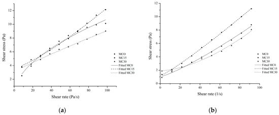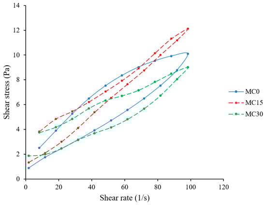The area of the hysteresis loop represents the energy necessary to destroy the structure of the material [21,30]. In our study, MC addition reduced the hysteresis areas compared to the control sample (Figure 1, Table 1).