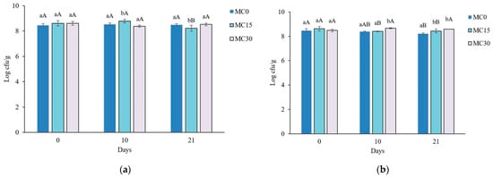 Viable counts of Streptococcus thermophilus (a) and Lactobacillus delbrueckii subsp. bulgaricus (b) in goat yoghurt during storage. MC0—control yoghurt without mucilage; MC15—yoghurt with 1.5% of mucilage; MC30—yoghurt with 3.0% of mucilage. Different lowercase letters indicate significant differences between samples in the same storage point. Different uppercase letters indicate statistically significant difference between samples during storage (p < 0.05).