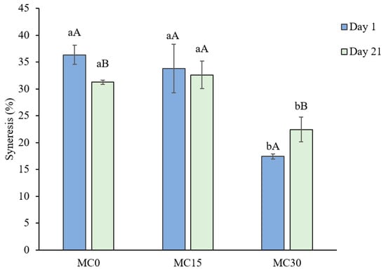 Induced syneresis (%) of goat milk yoghurt measured after 1 day and 21 days of storage. Yoghurt samples: MC0—control yoghurt without mucilage; MC15—yoghurt with 1.5% mucilage; MC30—yoghurt with 3.0% mucilage. The data are the mean values of three replicate trials ± standard deviation. Different small letters represent significant differences between yoghurts at the same time point; different uppercase letters represent significant differences when comparing one day after production and after 21 days of storage (p < 0.05).
