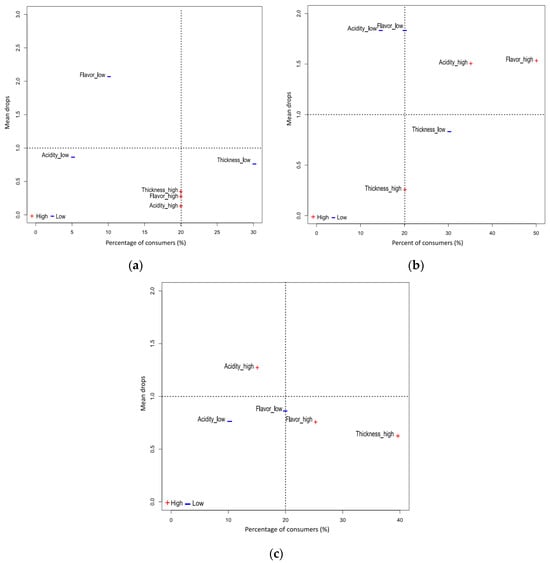 Mean drop plots of evaluated yoghurts: (a) MC0, (b) MC15 and (c) MC30. The too-low endpoint of the JAR scales is highlighted with blue; the too-high endpoint is highlighted with red. Horizontal axis represents the percentage of consumers who rated the non-JAR attributes, and the vertical dashed line represents the 20% threshold.