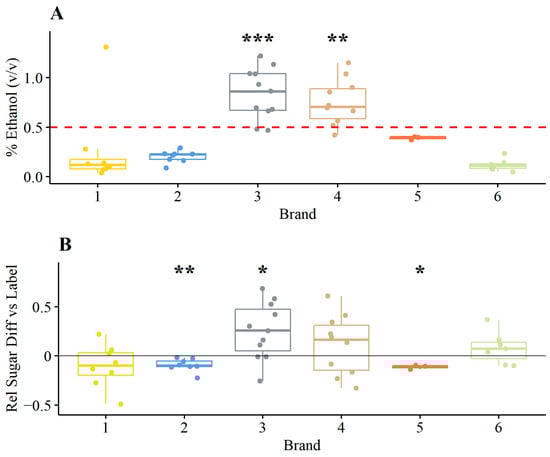 Physiochemical properties of samples within brands. % Ethanol (v/v) (panel A) and relative sugar content versus product labels (decimal fraction) (panel B). Asterisks indicate the statistical significance of t-tests for brands having greater than 0.5% ethanol and greater or less sugar content (two-sided, relative difference) vs. the label. * p < 0.05; ** p < 0.01; *** p < 0.001.