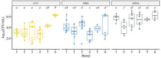 Samples were plated on GYC, MRS, and APDA media to determine whether differences in microbial loads were observed between brands. Most samples contained live microorganisms that grew on the three media types: GYC, 1.0–6.4 log10 CFU/mL (µ = 3.7); MRS, 1.0–6.5 log10 CFU/mL (µ = 3.9); APDA, 2.5–7.1 log10 CFU/mL (µ = 5.4). For each medium, significantly different microbial loads were observed across brands (ANOVA, p < 0.05) (Figure 2); pairwise comparisons confirmed that significant differences were also observed between brands (Tukey’s HSD, p < 0.05) within each media type. Probiotics added to the commercial products by producers—Bacillus subtilis to brand six and Bacillus coagulans to brand three—caused skewed counts in those samples that could not be adjusted by colony morphology; the counts on these plates showed that the probiotic strains survived the bottling process, transportation, and storage until purchase.