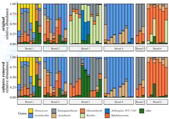 Filtered (i.e., sequences unidentified at the phylum level or identified as chloroplast or mitochondria removed) and decontaminated (i.e., sequences identified as contaminants using Decontam removed) data were agglomerated to the genus taxonomic level, converted to proportions, and plotted in Figure 3. Relative abundance plots show the samples before and after the added culture sequence removal. Before added culture removal, Bacillus and Arthrospira comprised a large proportion of reads in samples from brand three and some reads in samples from brands four and six. After the added cultures were ‘removed’, the six most abundant genera were Oenococcus, Lactobacillus, Komagataeibacter, Acetobacter, Gluconobacter, and Bifidobacterium.