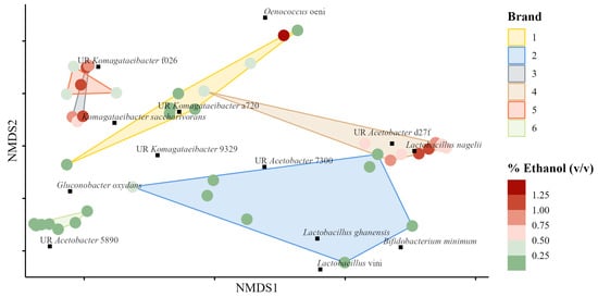 A distance matrix was computed using the Bray–Curtis [] (Bray and Curtis, 1957) method between samples on denoised species-agglomerated proportion data. Nonmetric multidimensional scaling (NMDS) was used to ordinate the samples and species (mean abundance > 1.0%), as shown in Figure 4. The clusters for brands three, five, and six were relatively small, indicating that the microbial communities were similar between products. Except for one outlying sample, the cluster for brand four would have been relatively small and tight, suggesting that the microbial communities for those products were similar too. Samples with high or low ethanol content did not group together, except within brands. Two Komagataeibacter spp. (one unresolved, and the other K. saccharivorans) were ordinated near high ethanol samples from brand three; one unresolved Acetobacter sp. and Lactobacillus nagelii were ordinated near high ethanol samples from brand four.