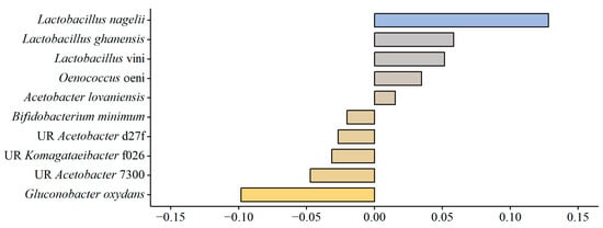 A permutational multivariate analysis of variance was conducted (PERMANOVA) [] using the computed Bray–Curtis distance matrix to determine whether there was an association between the observed bacterial community differences and the explanatory variables brand and product type (flavor) [bacterial dist. matrix ~ sequencing run + brand + product type, stratified within sequencing run]. Brand was highly significantly associated with the observed community differences (p < 0.0001), but product type (flavor) was not (p = 0.062). ZicoSeq was used to conduct a differential abundance analysis of species between brands, which is depicted in Supplementary Figure S2. The top 11 differentially abundant species were from the genera Gluconobacter, Komagataeibacter, Lactobacillus, Acetobacter, Oenococcus, and Bifidobacterium, which are the same as those plotted in Figure 3.