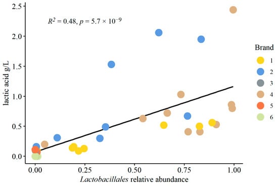 PERMANOVA was conducted [bacterial dist. matrix ~ sequencing run + brand + lactic acid] to calculate the top 10 bacterial species positively or negatively associated with lactic acid content (Figure 5). Four of the five positively correlated species are members of the Lactobacillales order: Lactobacillus nagelii, Lactobacillus ghanensis, Lactobacillus vini, and Oenococcus oeni; four of the five negatively correlated species are members of the Acetobacteraceae order: Gluconobacter oxydans, two unresolved Acetobacter spp., and one unresolved Komagataeibacter sp. This result indicated an association between Lactobacillales and lactic acid content. Therefore, the relative abundance of Lactobacillales was plotted against lactic acid content for all samples (Figure 6), and a Kendall correlation test was conducted. There was a highly significant correlation between the relative abundance of Lactobacillales and lactic acid in kombucha samples (Kendall correlation test, p < 0.0001).