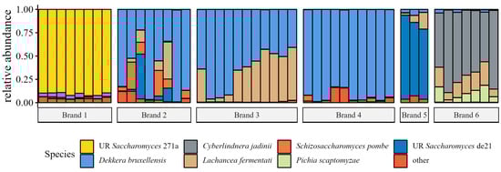 Filtered and decontaminated data were agglomerated to the species taxonomic level, converted to proportions, and plotted in Figure 7. The seven most abundant species were two unresolved Saccharomyces spp., Dekkera bruxellensis, Cyberlindnera jadinii, Lachancea fermentati, Schizosaccharomyces pombe, and Pichia scaptomyzae. Except for brands two and three, the microbial communities were dominated by a single species.