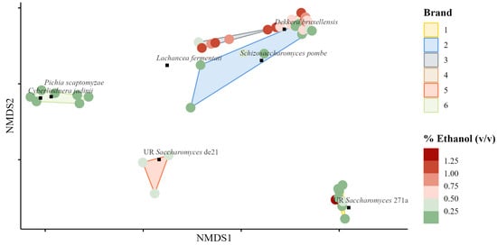 A Bray–Curtis distance matrix was computed between samples on denoised species-agglomerated proportion data. An NMDS ordination of samples and species (mean abundance > 0.01) is shown in Figure 8. The products from most brands, excluding brand two, were clustered into small distinct groups, indicating that the microbial communities were similar between products of the same brand. Unlike the bacterial community ordination, most high ethanol samples were grouped together. The species that were most closely associated with high ethanol samples were Dekkera bruxellensis, Lachancea fermentati, and Schizosaccharomyces pombe.