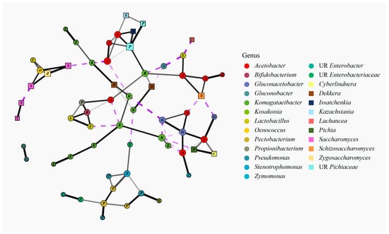 Other packages used for data analysis include ggpubr (0.5.0) [], ggtext (0.1.2) [], ggnewscale (0.4.8) [], igraph (1.6.0) [], and ggnetwork (0.5.13) []. The full code used to process raw reads and analyze data is deposited and accessible at https://github.com/jsogin574/Sogin_and_Worobo_Kombucha_2024, accessed on 30 June 2024.