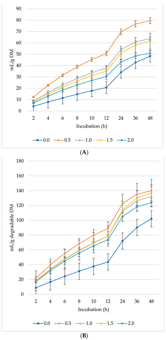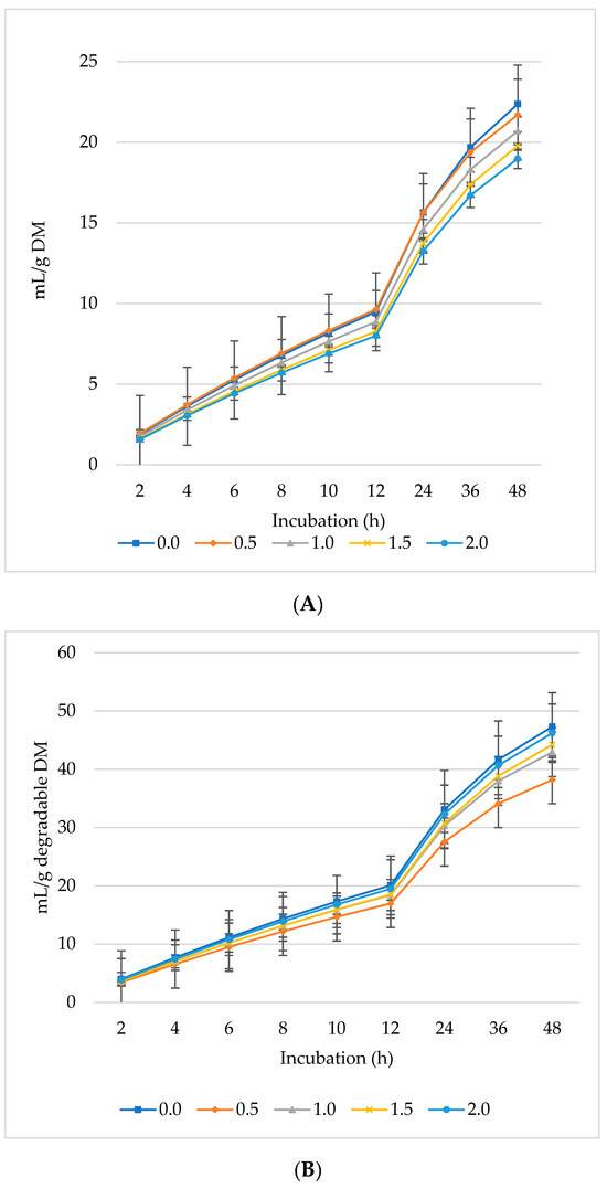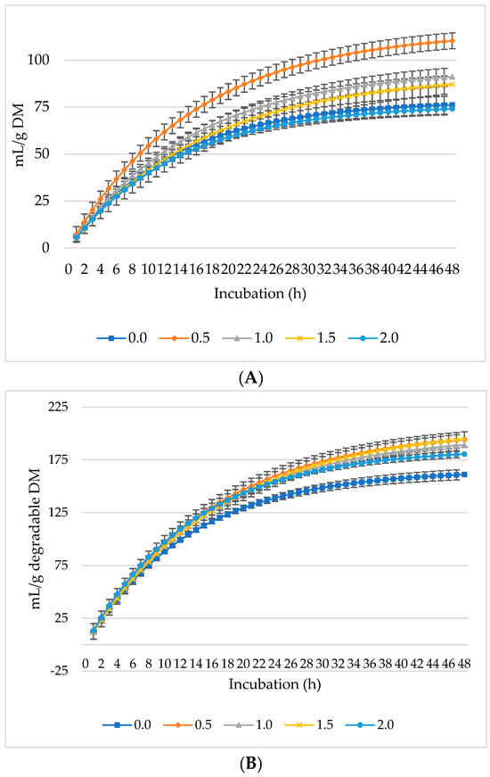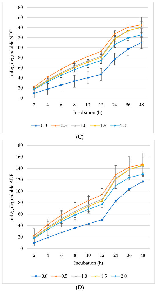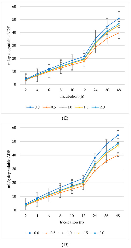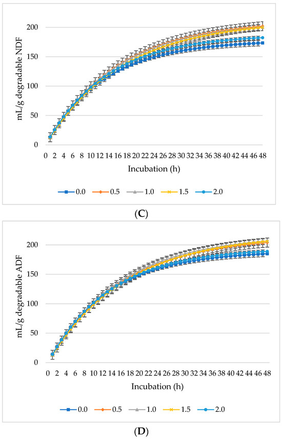 Figure 1, Figure 2 and Figure 3 represent GP, CH4, and CO2 as mL/g DM, dDM, dNDF, and dADF. The maximum GP was noted at 0.5% inclusion of L. nobilis leaves, followed by a 1% and 1.5% dietary inclusion. Gas production (mL/g DM) rose linearly with incubation hours (Figure 1A). The lowest GP observed at the 2% L. nobilis leaves inclusion. Conversely, 0.5%, 1%, and 1.5% inclusion of L. nobilis leaves resulted in optimal GP per gram of dDM (Figure 1B), dNDF (Figure 1C), and dADF (Figure 1D). The 0.5% inclusion level achieved the highest (linear, p = 0.006; quadratic, p < 0.001) asymptotic GP, followed by 1% and 1.5%, while the 2% inclusion did not affect it compared to the control level (Table 3). Without affecting the rate of GP, the level 0.5% showed the lowest lag time, while the level 2% showed the highest one (linear, p = 0.002, quadratic, p = 0.039).