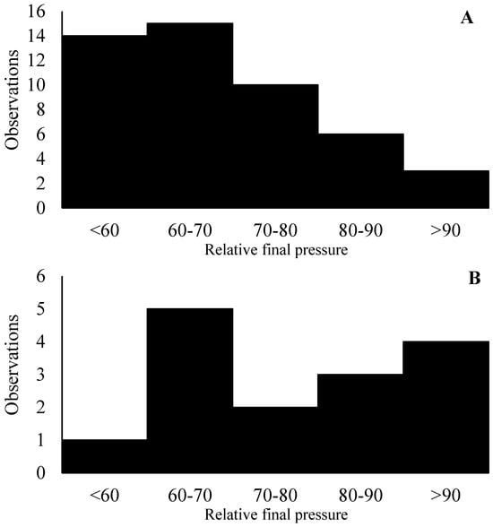 Distribution of the relative final pressure of the canisters during experiments 1 (n = 48) and 2 (n = 16). The X-axis represents the distribution of the relative final pressure of canisters. The Y-axis represents the number of observations.