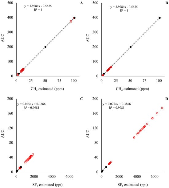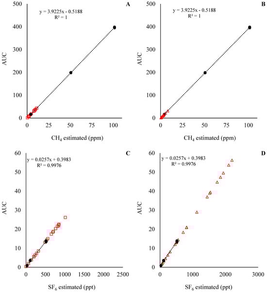 The standard curve for the predicted CH4 and SF6 concentrations for Exp1 and Exp2 are presented in Figure 4 and Figure 5, respectively. With the standard curves commonly used for the estimation of CH4 emissions in in vivo settings, the concentration of CH4 and SF6 was underestimated and overestimated, respectively. This means that during the analysis of the samples, the concentration of CH4 in the samples was below the analytical limits of the standards (Figure 4A,C and Figure 5A,C), while the concentration of SF6 in the samples was above the analytical limits of the standards (Figure 4B,D and Figure 5B,D). Those results indicate that an adjustment of SF6 released inside the fermenters is required. For instance, the ratio between CH4:SF6, in mg units, for the standards was on average 266, while the CH4:SF6 ratio in Exp1 samples was 1146 ± 390 and 386 ± 180, and in Exp2 it was 709 ± 74.3 and 262 ± 31.3 for the low and high SF6 release rate, respectively.