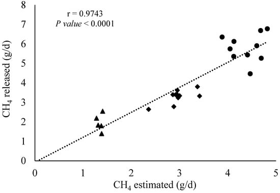 Correlation analysis between the CH4 infusion rate within the fermenters and the estimated CH4 emissions (in g/d) using the SF6 tracer technique is presented in Figure 6. The correlation coefficient (r) from the Pearson analysis using the whole dataset (n = 36 observations) demonstrated that those two variables are positively correlated (r = 0.97 and p < 0.001). To check if the correlation was influenced by all observations, the data corresponding to the treatment zero CH4 infusion was removed, while a similar pattern (r = 0.92 and p < 0.001) for the remaining 24 observations was observed.