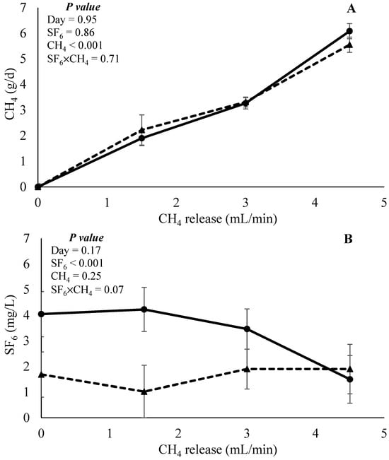 Pinares-Patino et al. [] have conducted a study to evaluate the effects of the rate of SF6 release (1.90, 3.62, 5.28, or 11.1 mg/d) for the estimation of CH4 emission in vivo. Authors reported no effects of SF6 release rate on CH4 concentration (48.0 ppm); however, there was a positive linear effect of SF6 release rate on the SF6 concentration (119, 238, 279, and 524 ppt, respectively) and a negative linear effect of SF6 release on CH4:SF6 ratio (455, 266, 225, and 105, respectively). When evaluating the effects of the SF6 release rate upon CH4 emission and yield by unit of dry matter intake, the authors reported a positive linear effect for both variables. Those results suggest that CH4 emission and yield per unit of degraded nutrients are dependent on the SF6 release rate, where a greater SF6 release rate may estimate greater values of CH4 yield. In another study, Martin et al. [] evaluated the interaction effects of the site of collection (breath gas or ruminal gas) and the rate of SF6 release on the estimation of CH4 emission in non-lactating cannulated Holstein cows. Authors reported no interaction effects between those two factors; in addition, a high SF6 release rate (3.15 mg/d) enabled a greater estimation of CH4 emission (105.3 vs. 118.1 L/8-h period) when compared to a low SF6 release rate (1.58 mg/d). Current study results partially corroborate the findings of Pinares-Patino et al. [] and Martin et al. []. It was demonstrated that at low levels of CH4 production, the effects of SF6 release rate are small; however, when the technique is used on scenarios with a high CH4 production, high levels of SF6 release rate would estimate a greater CH4 emission than low SF6 release rate.