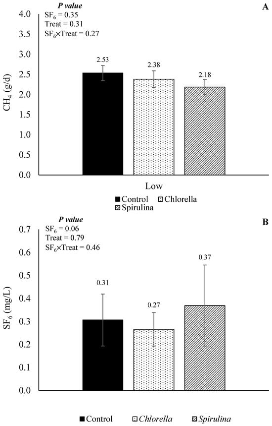Effects of SF6 release and partial replacement of soybean meal (control) with Chlorella or Spirulina in CH4 production (A) and concentration of SF6 (B) in the sample.