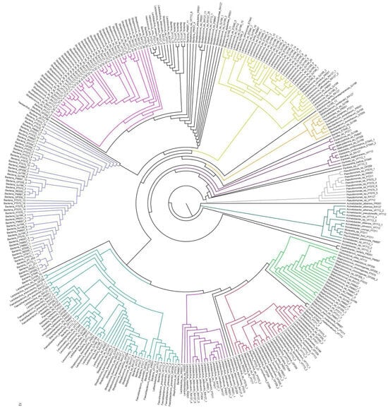 - Tamura, K.; Stecher, G.; Kumar, S. MEGA11: Molecular Evolutionary Genetics Analysis Version 11. Mol. Biol. Evol. 2021, 38, 3022–3027. [Google Scholar] [CrossRef]