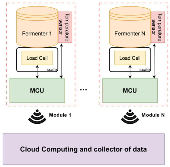 As shown in Figure 1, each monitoring module is connected to a server that collects the information through wireless communication. Each module comprises a microcontroller, a temperature sensor, four load cells that convert the force applied to them into electrical signals, the necessary circuitry to condition the acquired signals, and the mechanics required to be placed under the fermenter.