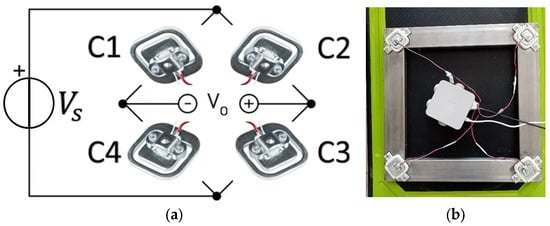 Each load cell has a maximum capacity of 50 kg and an output sensitivity equal to 1.0 ± 0.1 mV/V. Four cells were used to create the custom scale; they were placed at the vertices of the metal frame and connected in a Wheatstone bridge configuration (Figure 2a). This configuration enabled a maximum measurement capacity of 200 kg with a resolution of 1 g.