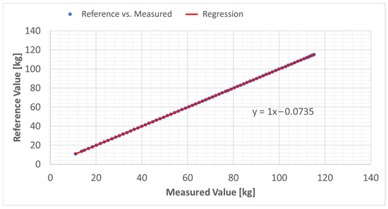 We calculated the regression and adjusted the measured values using the obtained coefficients to assess the accuracy. Subsequently, we examined the residuals, removing all the outliers and obtaining a maximum residual of 0.13 kg, corresponding to 0.07% of the full scale.