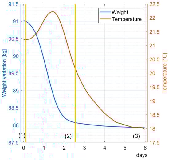 During the fermentation process, a loss of wort weight is expected due to the conversion of sugars into alcohol and carbon dioxide, which is released through the fermenter airlock. Simultaneously, there is an increase in temperature because fermentation is an exothermic reaction; this one in the figure represents a preliminary acquisition in which the temperature is also measured since the quality of beer depends on the temperature reached during fermentation; the latter is controlled to keep it constant throughout the process. Again, in Figure 5, the three main stages of fermentation can be appreciated: