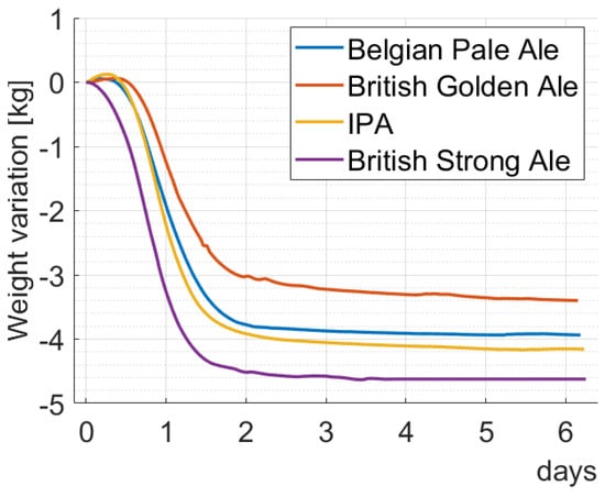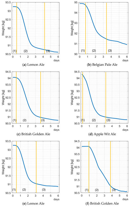 The fermentation progress over six days for six different beer batches is shown in Figure 6. The three phases of the fermentation are visible. In the first one or two days, the weight does not change during the lag phase, and then it decreases exponentially. Lastly, it settles to a value corresponding to the end of fermentation (stationary phase). In more detail, Figure 6a,e refer to different batches of the same type of beer (lemon ale), which has the lowest original gravity (OG) among the beers taken into account (1.036 g/cm3). This means that it contains a lower wort extract than the other types of beer and, as expected, exhibited the lowest quantity of released carbon dioxide. A greater weight decrease can be seen in Figure 6c,f, corresponding to the fermentation of two batches of British golden ale (OG 1.045 g/cm3) and more in Figure 6b, corresponding to the Belgian pale ale with an OG of 1.054 g/cm3. Another important aspect of the fermentation evolution is the duration of the three phases, particularly the lag and the exponential phases. These strongly depend on the characteristics of the yeast strain, the pitching rate (the quantity of yeast inoculated in the wort), temperature, and the original gravity of the wort. In this regard, the fermentation evolution shown in Figure 6d exhibited the shortest lag time. This was due to the characteristics of the Lallemand LalBrew Wit™ yeast (Lallemand, 1620 Rue Préfontaine, Montréal, QC, Canada) used in the apple with ale recipe.