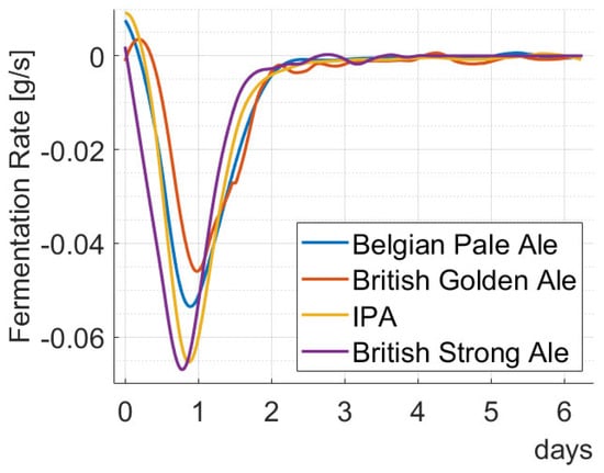 where ∆W is the change in weight in the time interval ∆t, which is 10 s. The fermentation rate is almost zero in the lag phase and at the end of fermentation, and it is negative when the fermentation is active, with the maximum value indicating a faster weight decrease during the exponential phase. Figure 8 shows the fermentation rate for the four batches.