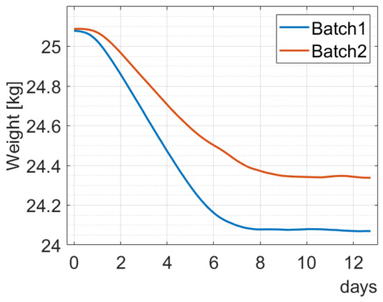 A new parameter, the fermentation rate (FR), has been introduced to highlight the evolution of the three phases of the fermentation process. This rate is defined as the variation of the weight per second. Figure 7 and Figure 8, respectively, show the fermentation evolution and the related fermentation rates of four batches. These batches used two types of yeast: Fermentis SafAle™ S-04 (Fermentis By Lesaffre, 90 Rue de Lille, 59520 Marquette-lez-Lille, France) for batches one, two, and four, and Fermentis Safbrew™ BE-256 (Fermentis By Lesaffre, 90 Rue de Lille, 59520 Marquette-lez-Lille, France) for batch three. In this context, the fermenter capacity is 150 L, the beer quantity is 95 L, and the room temperature is 19 °C. The results of this experiment, including the original gravity for each batch, are listed in Table 4.