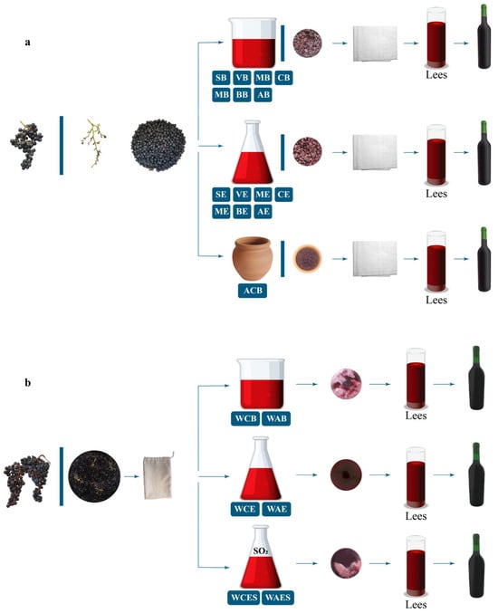 Illustration of the different winemaking processes performed in beakers and Erlenmeyer flasks: (a) skin-contact macerated red wines; (b) no skin-contact fermented white wines with and without the addition of sulfur dioxide. For sample descriptions, see Table 1.