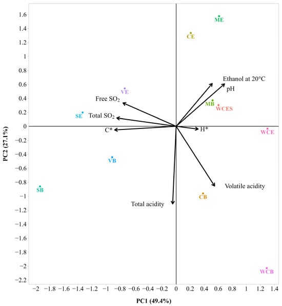 Bi-plot of the Principal Component Analysis (PCA) with the main physicochemical parameters of the 2020 wines (sample description in Table 1). The small and large angles between the corresponding variables represent the degree of relationships. The vector lengths indicate the strength of the correlation (closeness) of the corresponding parameter with the experimental samples. The percentage values (in parentheses) represent the proportion of explained variance for each principal component.