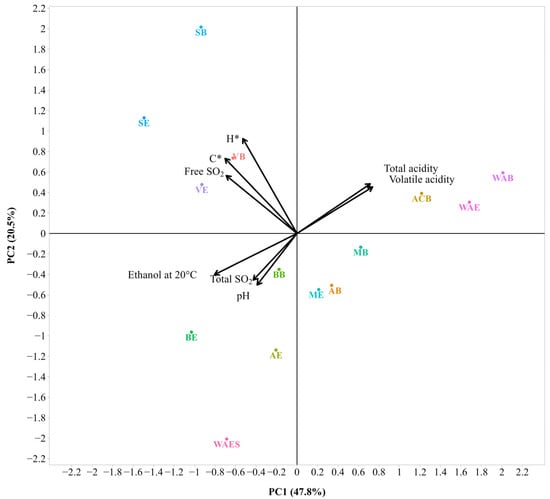 For better visualization of the data from both years (2020–2021), principal component analysis (PCA) was performed to identify the relationships among the mean values of the eight measured variables (Figure 3 and Figure 4). As displayed in Figure 3, the first two PCs explained 76.5% of the total variance of the entire dataset. This is an acceptably large percentage of variation. With the addition of the third component (PC3) system, it increased up to 89.8%. The first principal component (PC1) yielded the highest variation (49.4%) and had a strong positive loading for pH and strong negative loadings for free SO2, total SO2, and chroma (C*). The second principal component (PC2) yielded the lowest variation (27.1%) and had strong negative loadings for volatile acidity and total acidity. Finally, the third principal component (PC3) made a small contribution (13.3%) to the total variation in the data and was dominated by a large negative loading for hue (H*) (Table S2). The correlation between the variables was also described. Ethanol and pH were positively correlated to each other. A positive correlation was also found between parameters such as C*, total SO2, and free SO2. Volatile acidity and free SO2 were negatively correlated to each other.
