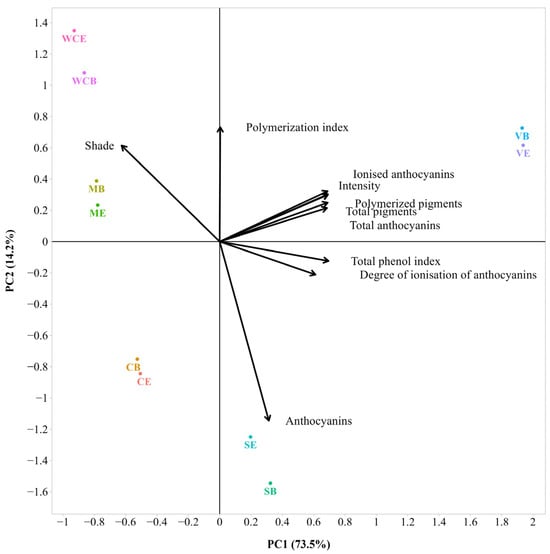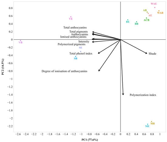 The PC1 and PC2 captured 77.6% and 14.5% of the variations in the dataset, shown in Figure 6. Approximately two-thirds of the data are represented by the first (main) component. The corresponding cumulative amount of explained variance by two PCs is 92.1%, which is enough to accurately represent the data. Color intensity, anthocyanins, total anthocyanins, ionized anthocyanins, total pigments, and polymerized pigments have strong negative loadings on component 1. All of these parameters showed positive correlations with each other. Shade had a strong positive loading on component 1 and was negatively correlated with total anthocyanins. The degree of ionization of anthocyanins and polymerization index had large negative loadings on component 2 (Table S5).