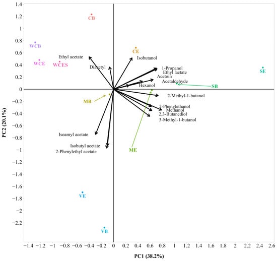 Bi-plot of the Principal Component Analysis (PCA) with volatile aroma composition of the 2020 wines (sample description in Table 1). The small and large angles between corresponding variables represent the degree of relationships. The vector lengths indicate the strength of the correlation (the closeness) of the corresponding parameter with the experimental samples. The percentage values (in parentheses) represent the proportion of explained variance for each principal component. The colored lines are used to connect some data labels to their respective points in order to avoid overlapping (SB, MB, and ME).