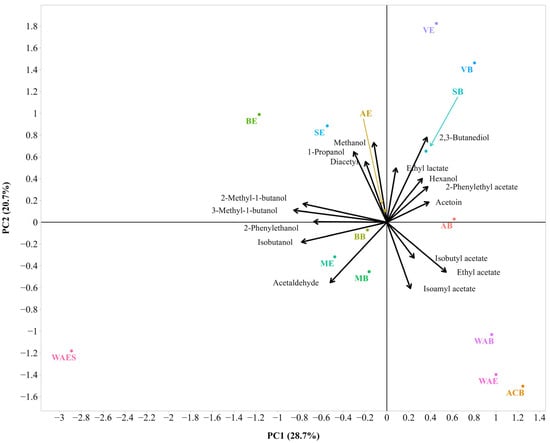 As shown in Figure 8, PC1 accounted for 28.7%, and PC2 accounted for 20.7% of the variations within the dataset. The cumulative variance explained by two PCs was 49.4%, followed by three PCs (63.5), four PCs (75.1), and five PCs (84.1). Isobutanol, 2-methyl-1-butanol, 3-methyl-1-butanol, and 2-phenylethanol had strong negative loadings on component 1. Methanol, 1-propanol, and 2,3-butanediol had strong positive loadings on component 2, while isoamyl acetate had a strong negative loading on component 2. Ethyl acetate, acetoin, isoamyl acetate, and 2-phenylethyl acetate had strong positive loadings on component 3 (Table S7). Correlation analysis showed that 2-methyl-1-butanol and 3-methyl-1-butanol were positively correlated. Positive associations were also observed among methanol, 1-propanol, and diacetyl content. The latter were inversely correlated with isoamyl acetate. Acetaldehyde also showed an inverse association with hexanol and 2-phenylethyl acetate.